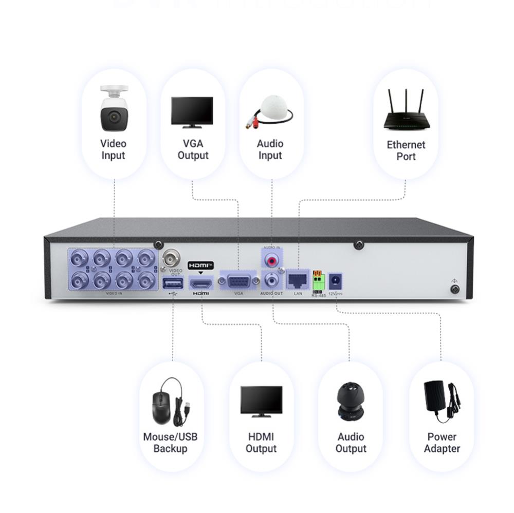 The Hikvision compatible OEM DVR is a hybrid digital video recorder (DVR) with 8 analogue BNC inputs that supports analogue TVI/CVI/AHD cameras up to 5 mega-pixel, and 4 IP cameras up to 8MP.
